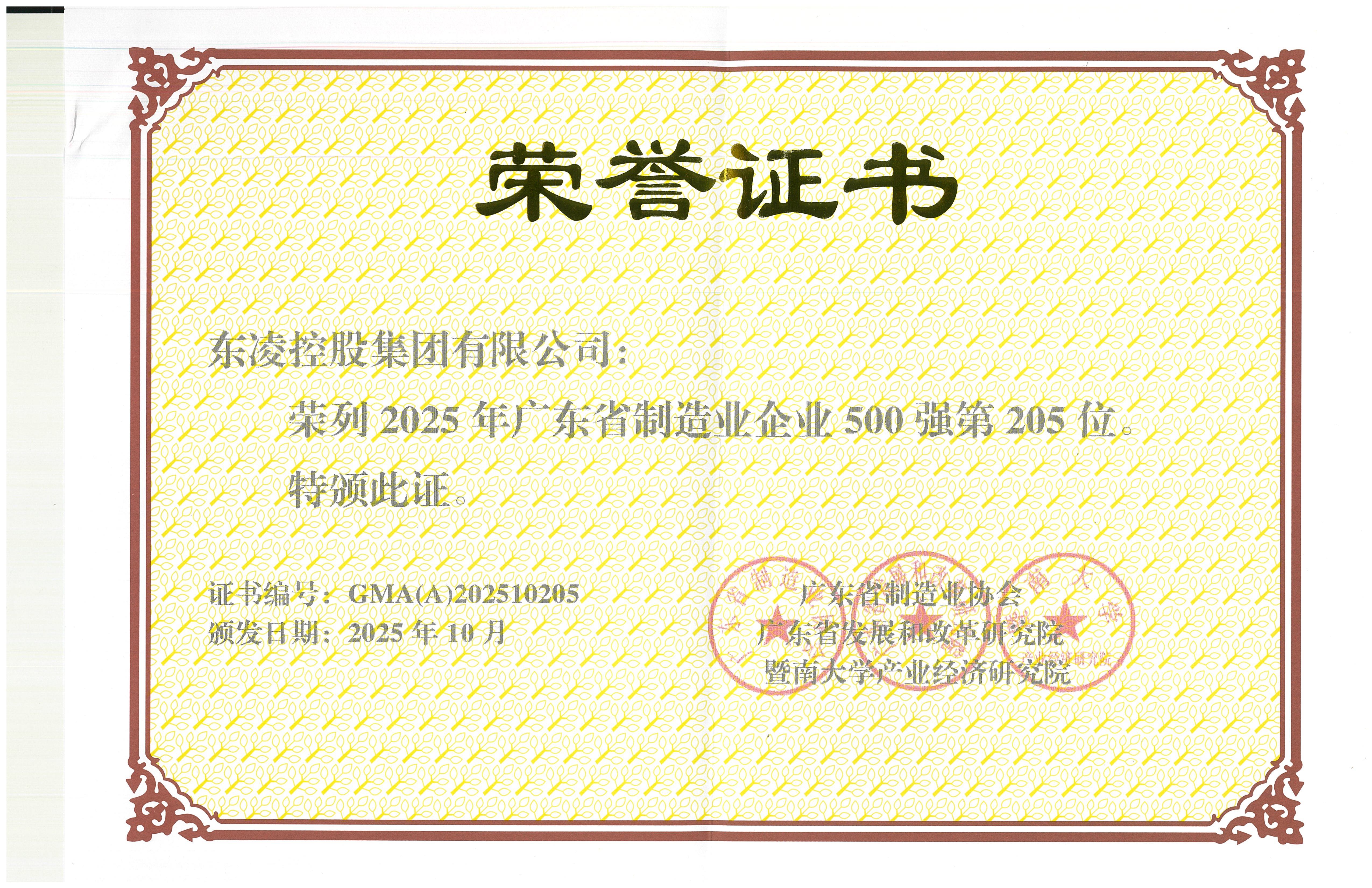 广东省制造业企业500强【第205位】202510【证书】